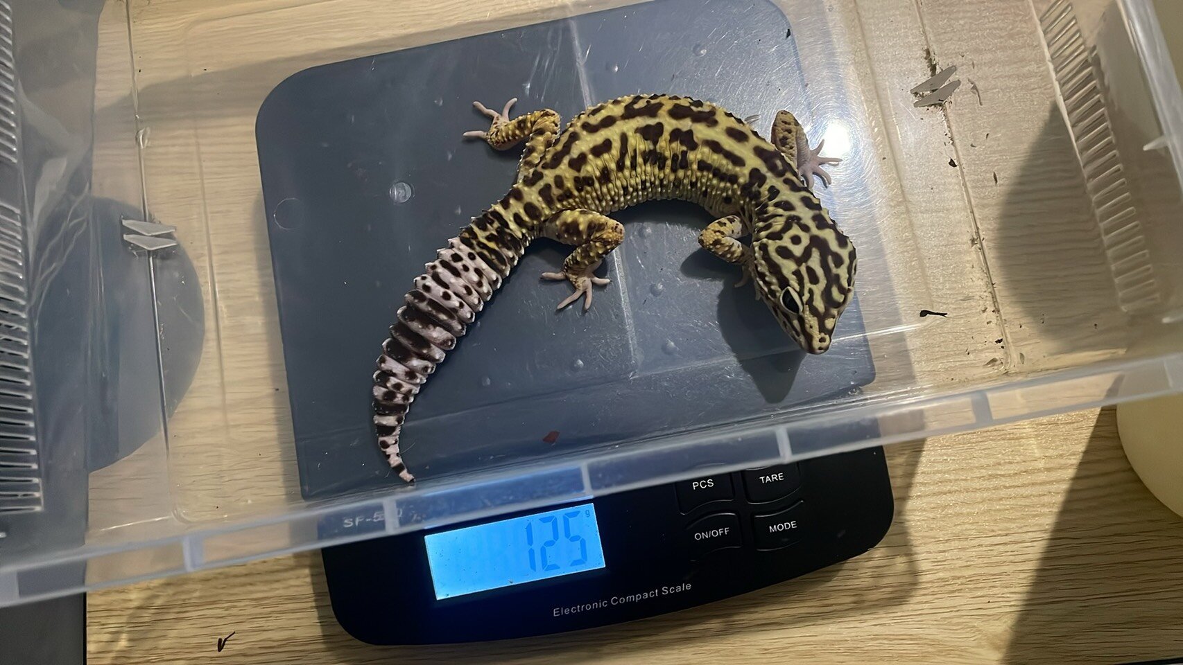 伊朗豹紋守宮站在電子秤上秤重:體型明顯比一般豹紋守宮壯碩